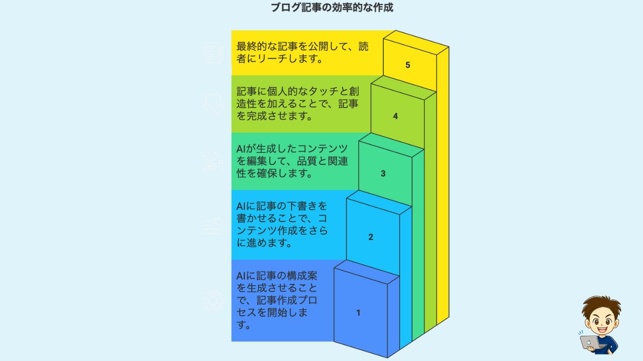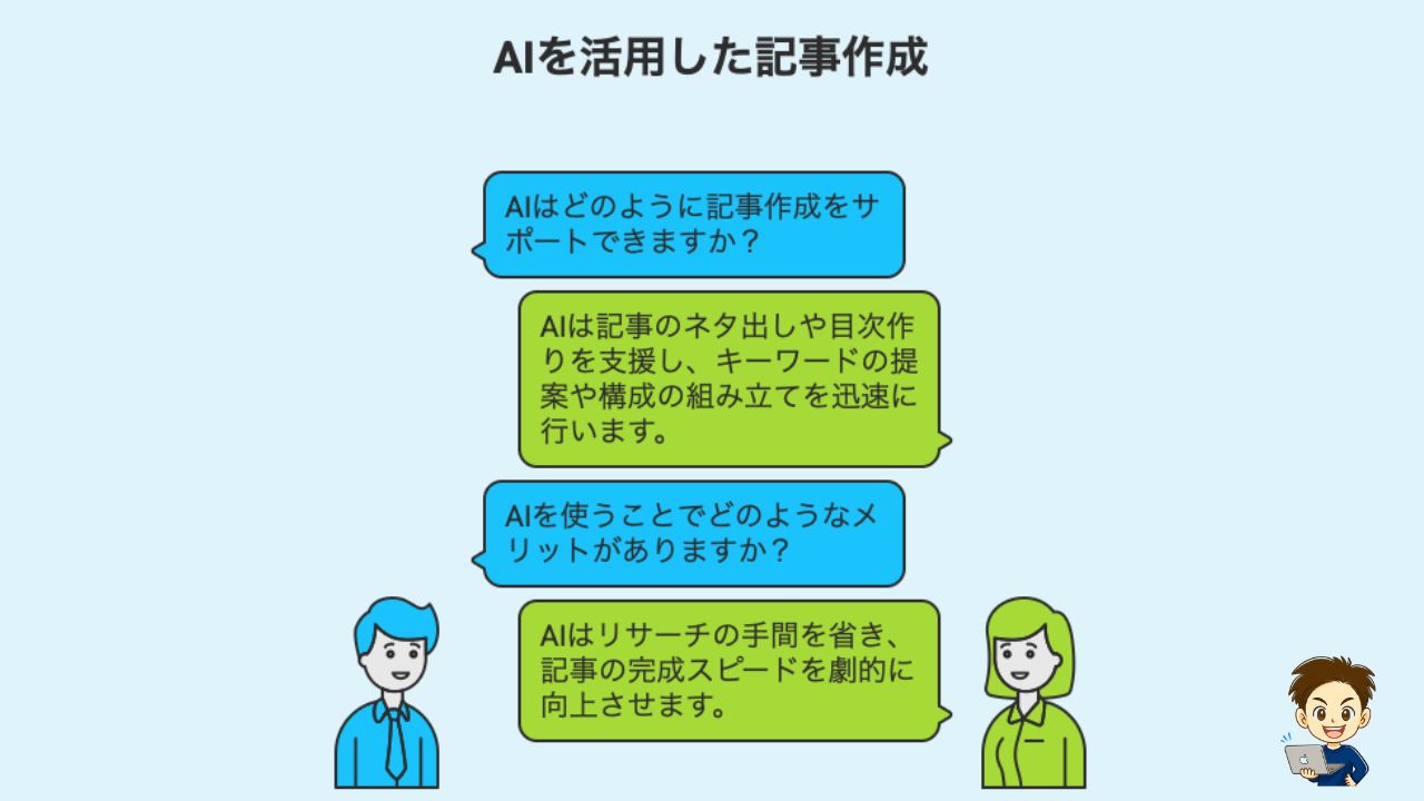 AIを使えば、一番大変な「ゼロから書き始める作業」が一瞬で終わります。AIは、書きたいテーマを渡すだけで記事の土台を作ってくれるからです。