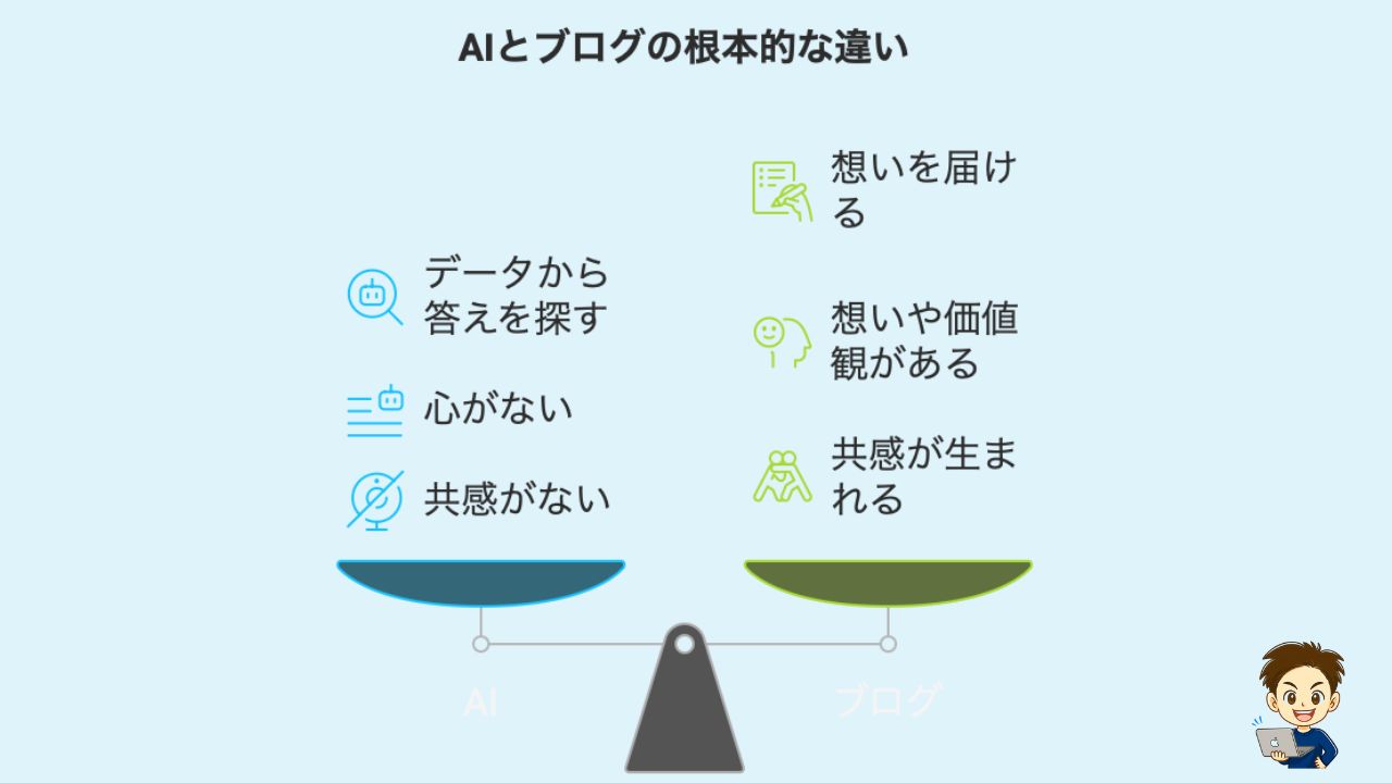 たくさんの記事にうもれて、あなたのブログが読まれにくくなるんです。また、AIが書く文章は、なんだかどれも似た雰囲気になりがちです。なぜならAIには、あなたのような「体験」や「気持ち」がないから。